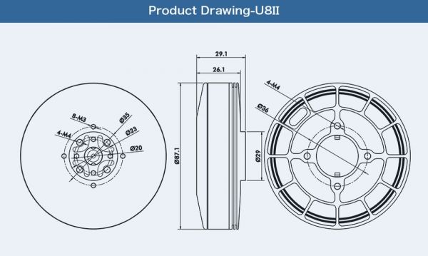 Die U8 II Motoren sind die neueste T-Motor Entwicklung aus der U-Reihe. Die Motoren verfügen über eine IP55 Schutzklasse, Silberdrahtwicklung und sind auf hohe Laufruhe und Zuverlässigkeit ausgelegt. Im Vergleich zur normalen U8 Reihe konnte die Leistung und Effizienz nochmals deutlich gesteigert werden.