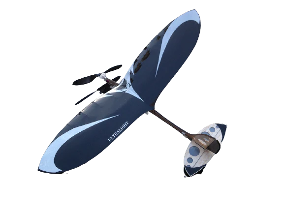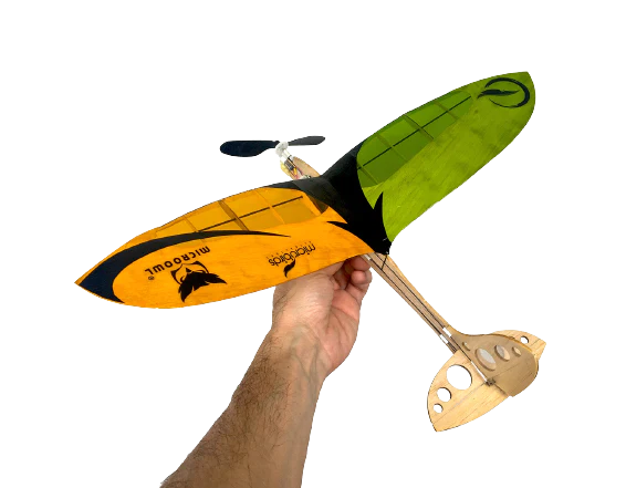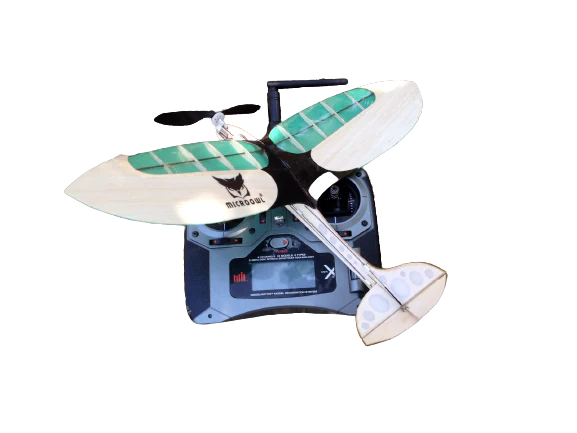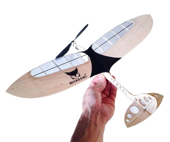Ultraleichtes Gewicht von 24 Gramm, Micro Owl ist lasergeschnitten aus Wettbewerbs-Balsaholz und Kohlefaser für strukturelle Festigkeit. Das Micro Owl-Design ist aufgrund seines geringen Gewichts und seiner Kohlefaserverstärkung praktisch unzerstörbar und basiert auf der Entwicklung des Eulen-Tragflächenprofils mit großer Flügelfläche, was zu einer geringen Flächenbelastung und einem niedrigen Seitenverhältnis führt, was zu einer maximalen Luftzeit beiträgt, die einen langsamen, anmutigen Flug ermöglicht. Perfekt für das Fliegen aus nächster Nähe (Hinterhoffliegen) mit über 10 Minuten vergnüglicher Flugzeit mit einer einzigen Akkuladung. Mit einem 5-Zoll-Propeller, der mit einem Mikro-2-Gramm-Getriebemotor mit 50000 U / min gekoppelt ist, der mit einem 1s 100 bis 150-mAh-Li-Po-Akku unbegrenzten vertikalen Aufstieg ermöglicht.